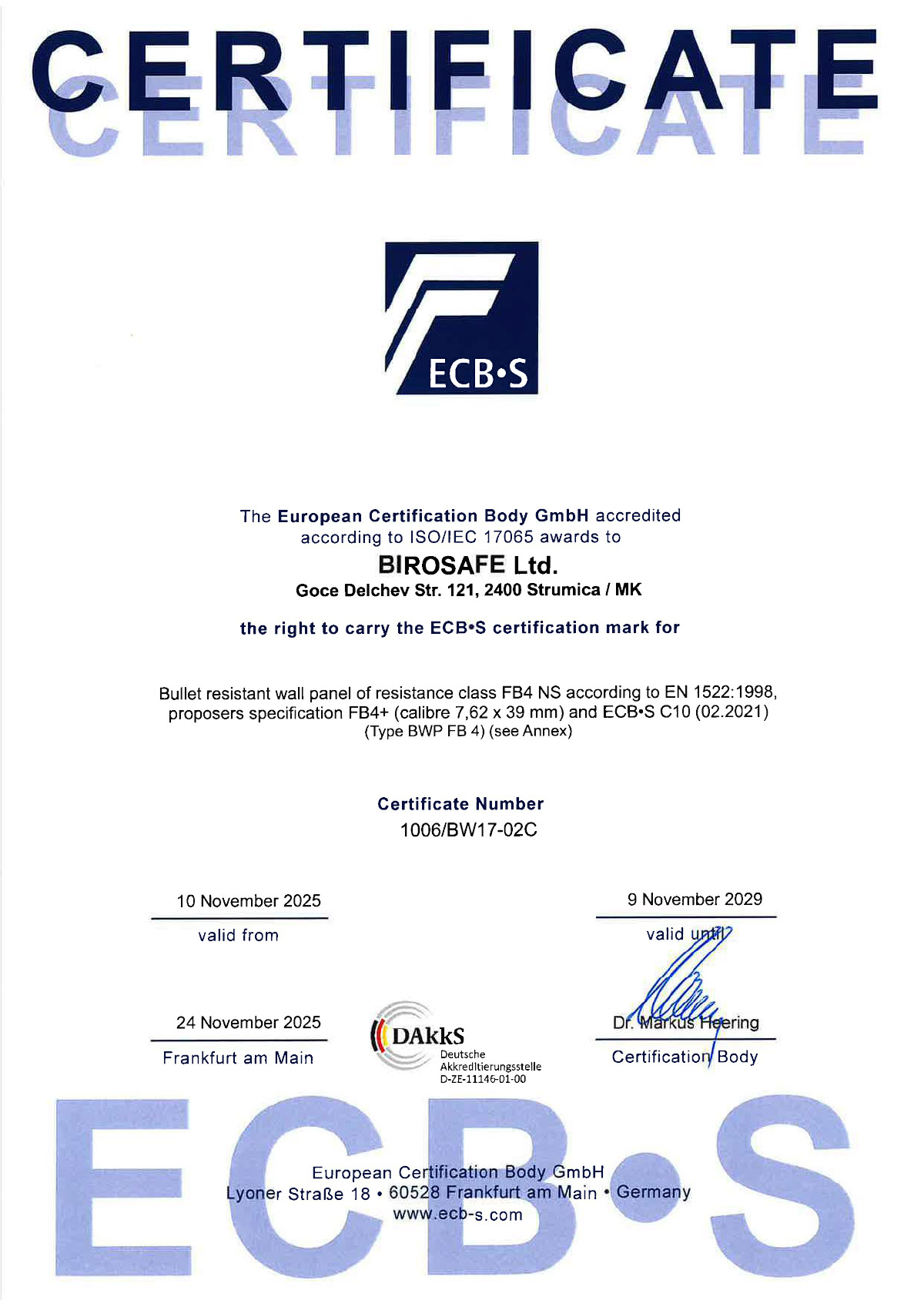 Сертификати за ѕидови и врати отпорни на куршуми (ECB-S Certified)