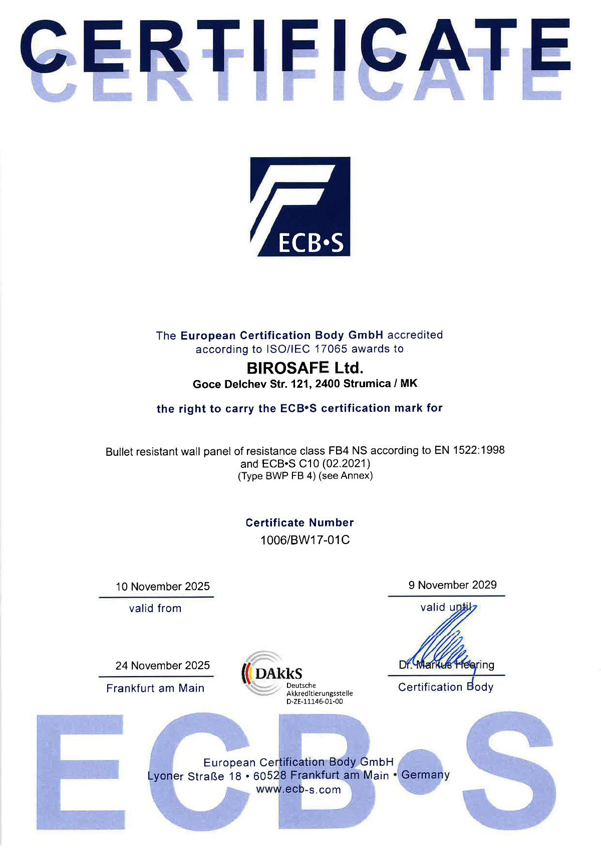 Certificates for Bullet resistant wall & door (ECB-S Certified)